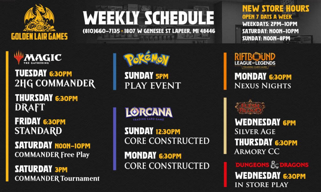 Golden Lair Games is a collectible trading card game store and play center located at 1807 W Genesee St in Lapeer, MI. We offer a variety of collectible card games such as Magic the Gathering, Pokemon and Lorcana. We provide a safe, welcoming environment to play these games and host regular events and tournaments. See our schedule below for more information.